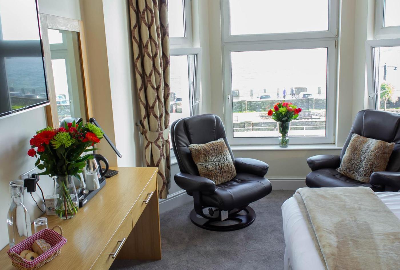 Twin Room with Sea View. This room has a stunning panoramic sea view of Douglas Bay. It is a spacious room with recliner chairs by the bay window. ;