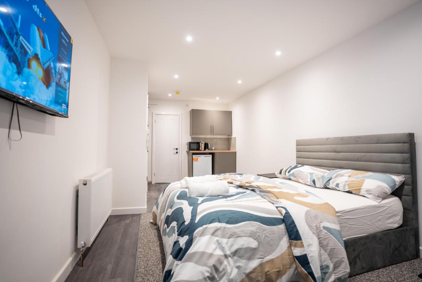 Deluxe Double Studio. Offering free toiletries, this studio includes a private bathroom with a walk-in shower. Guests can make meals in the fully equipped kitchenette that features a refrigerator, kitchenware and a microwave. The studio offers a flat-screen TV with streaming services, soundproof walls, a wardrobe, an electric kettle as well as city views. The unit offers 1 bed. ;