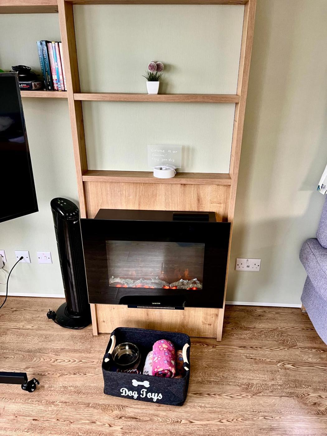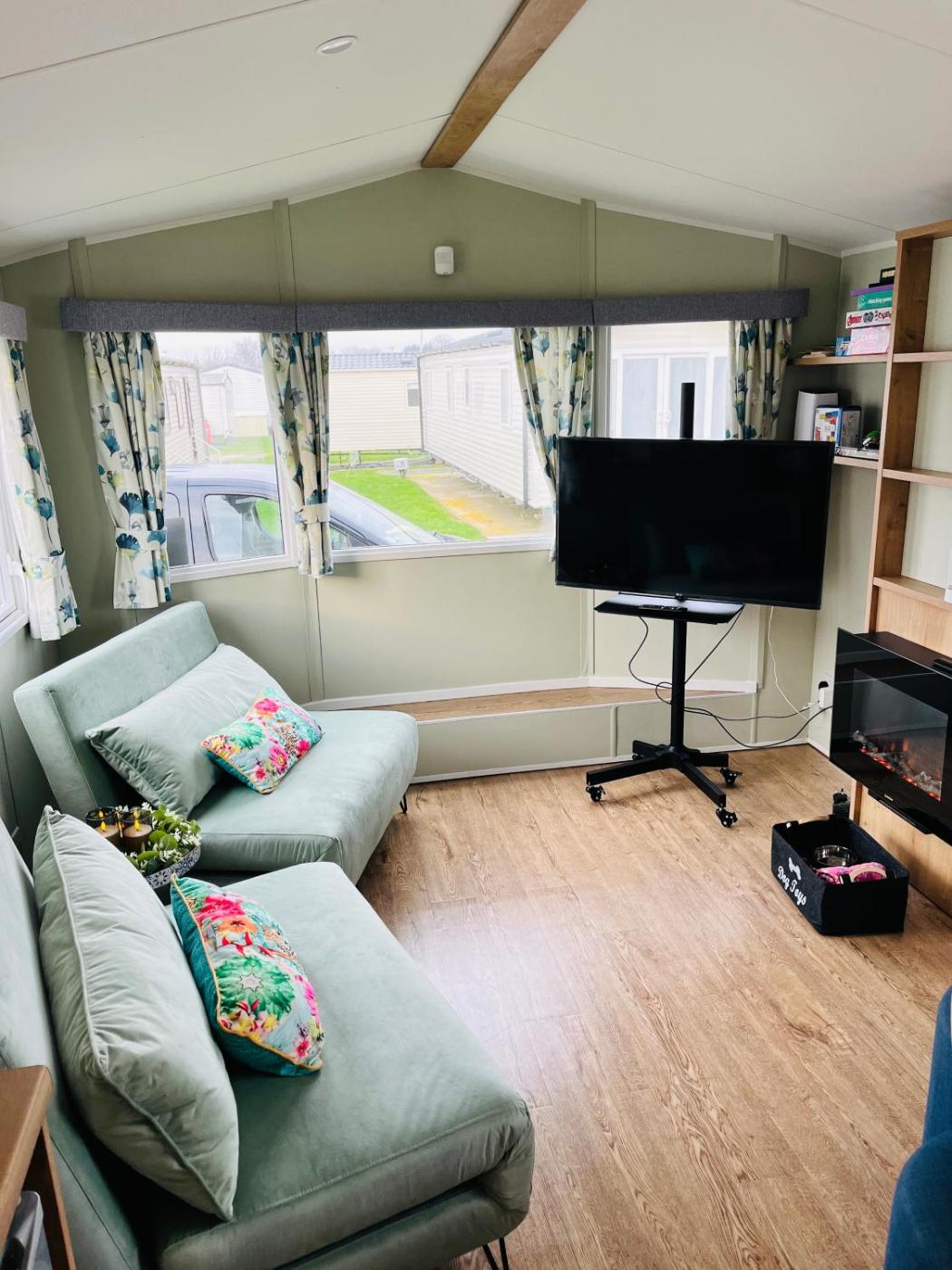 Caravan. The fireplace is a top feature of this mobile home. Boasting a private entrance, this mobile home comes with 1 living room, 2 separate bedrooms and 1 bathroom with a shower and a hairdryer. Guests can make meals in the kitchen that features a refrigerator, kitchenware, an oven and a microwave. This mobile home has a tea and coffee maker, flat-screen TV with streaming services, a quiet street view, as well as winechampagne for guests. The unit has 4 beds.