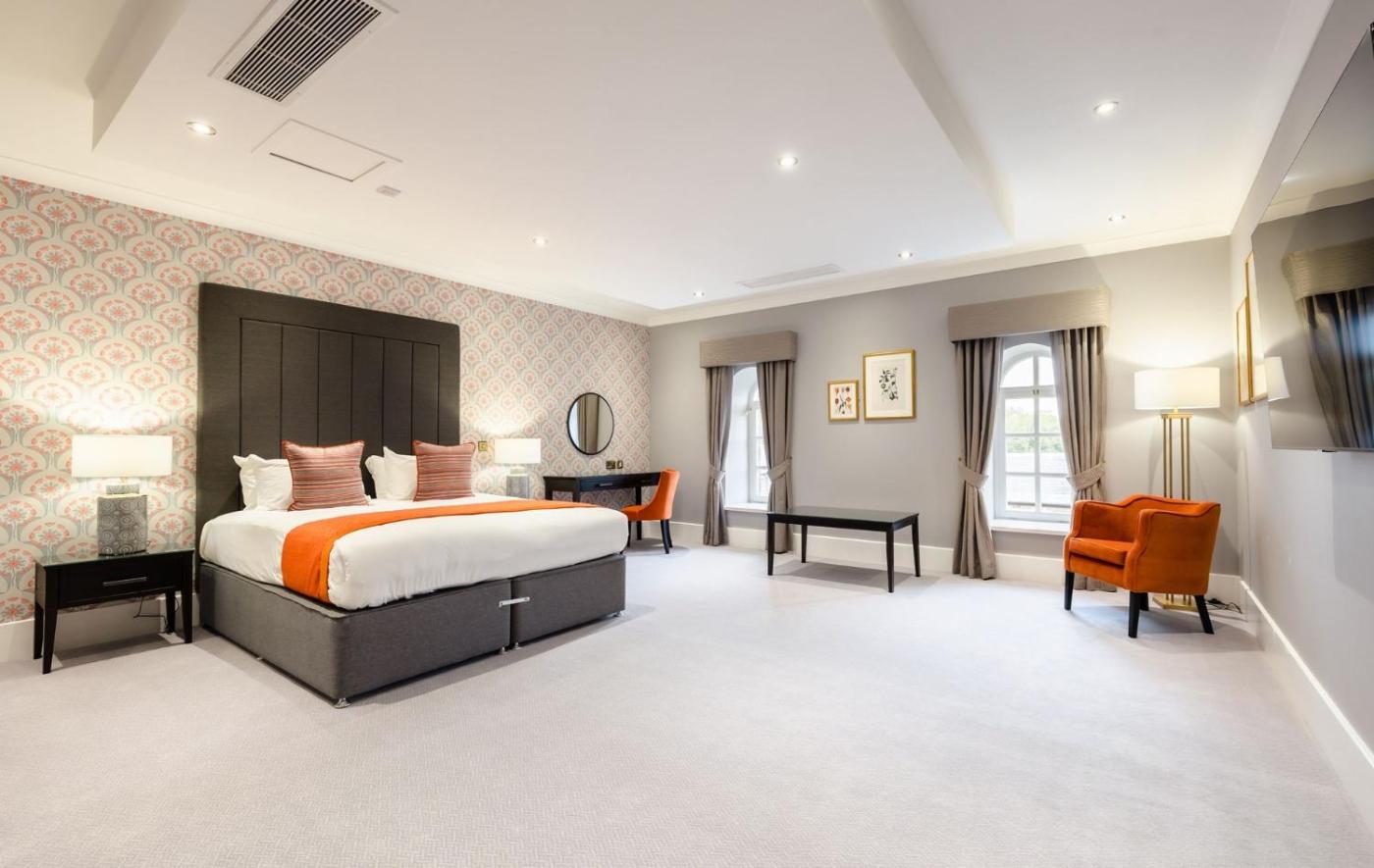 Large Double Room in Hensol Castle. The spacious double room has a private bathroom, air conditioning, a tea and coffee maker, as well as a seating area with a flat-screen TV. The double room features a wardrobe, a safe deposit box, a sofa, a carpeted floor, as well as a TV. The unit has 2 beds. ;