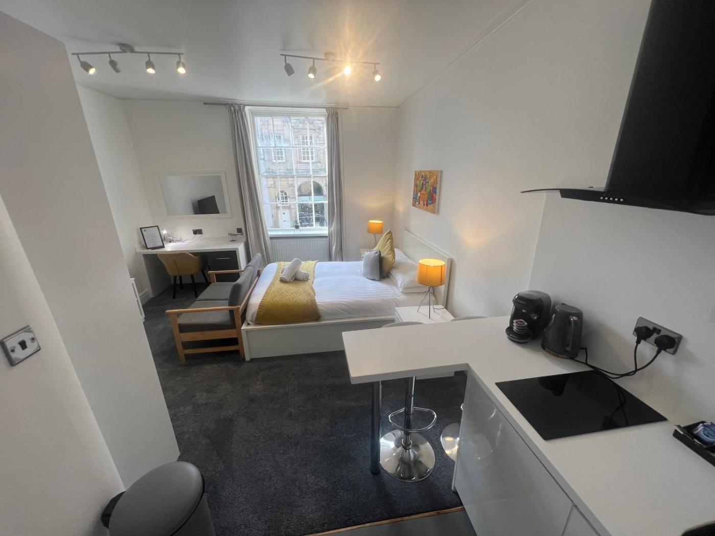 Deluxe Double Studio. Providing free toiletries, this studio includes a private bathroom with a shower and a hairdryer. The well-equipped kitchen features a stovetop, a refrigerator, kitchenware and a microwave. This studio has a coffee machine, flat-screen TV, city views, as well as chocolate for guests. The unit offers 1 bed. ;