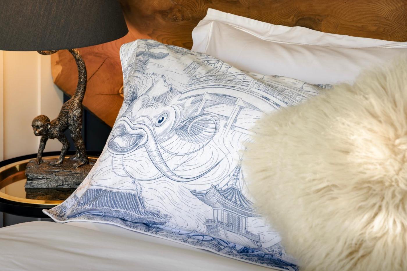 Towels and bed linen are featured in the lodge.