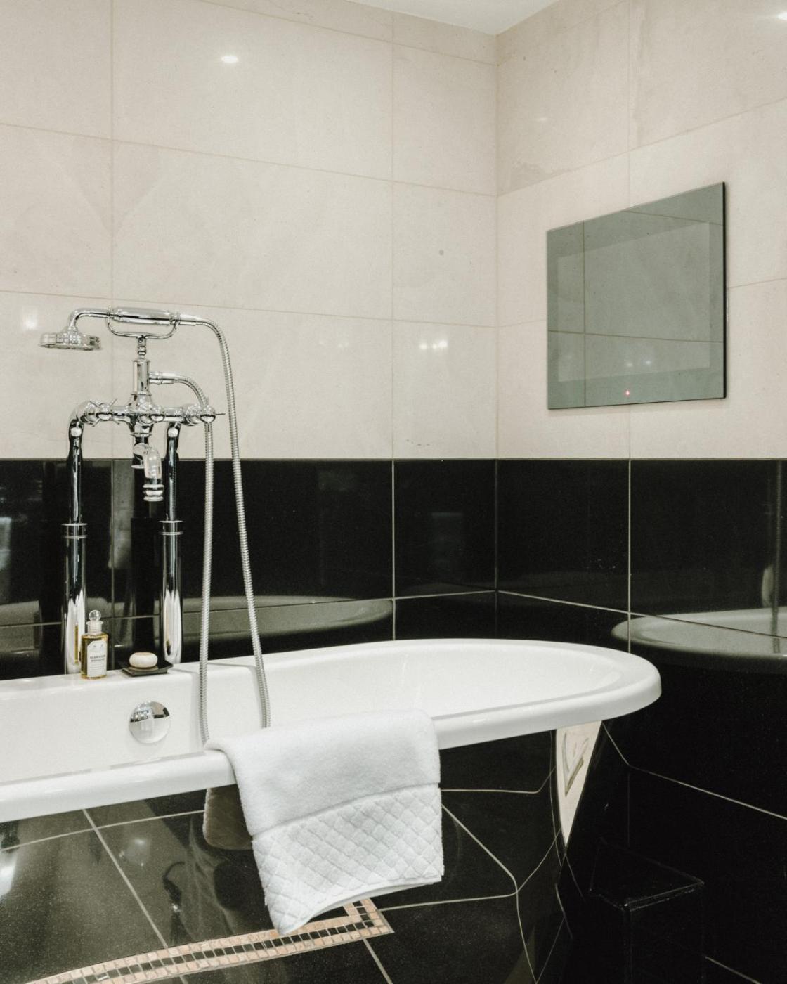 Junior Suite. Large suite with a Hypnos bed, handmade silk wallpaper, and a luxurious glass and chrome bathroom. Also features a separate living area with free Wi-Fi and a flat-screen TV. ;