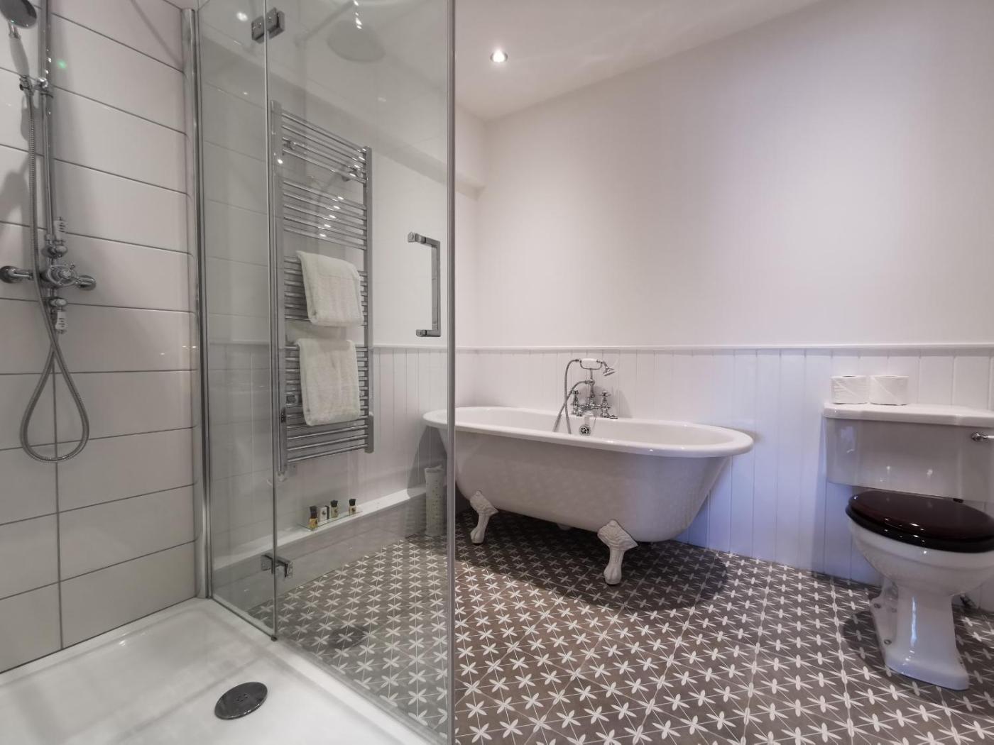 Superior King Room. This charming room has views overlooking West Bay & partial harbour views. It has a super king bed with luxurious duvet, sumptuous pillows, mattress topper, beautiful spacious en-suite with walk in shower & roll top bath along with a range of White Company products to use throughout your stay. • Sleeps 2 people • Flat screen 32-inch Smart TV • Dyson hairdryer • 2 armchairs • Refrigerator, Nespresso Machine, Safe ;